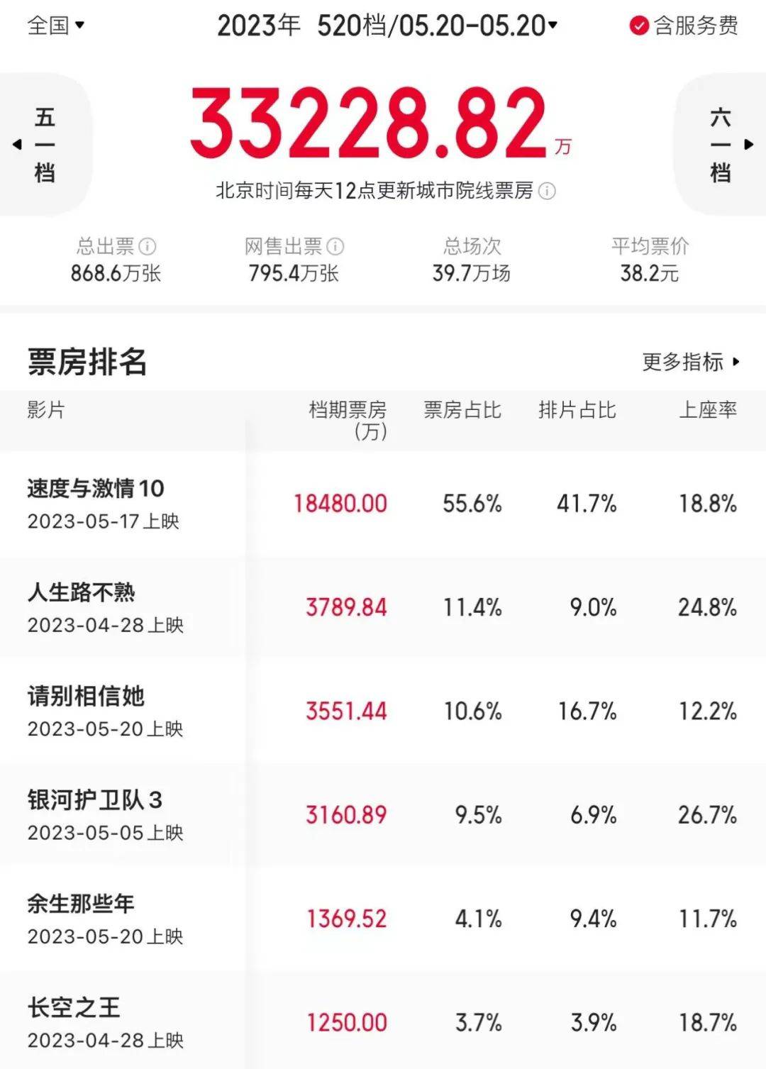 像只有两部爱情片上映的2023年520档,当天大盘却达到了3.32亿元,顺利刷新520档的影史票房新高。在520档中败走的,只有爱情片而已。