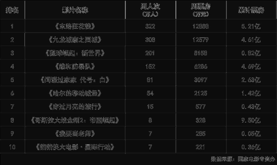 《九龙城寨之围城》连续三周冲进周票房榜前三名,上周以近1.26亿票房夺得周票房榜亚军。截至上周日,该片已累计获得4.61亿票房,观影人次突破1125万。在好口碑的加持下,该片目前的票房走势依然向好。