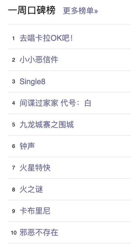 最后,还是例行附上一周豆瓣口碑榜的完整榜单: