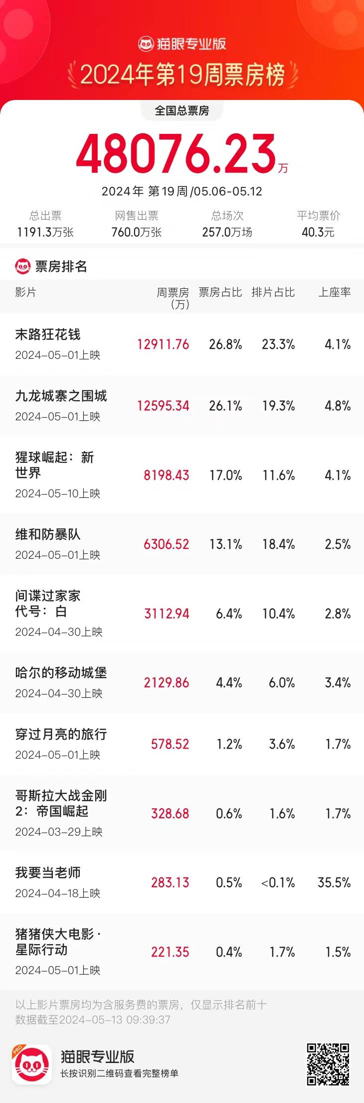 原标题:5.6-5.12内地一周报收4.8亿环比大跌70.87% 《末路狂花钱》1.29亿逆袭夺冠