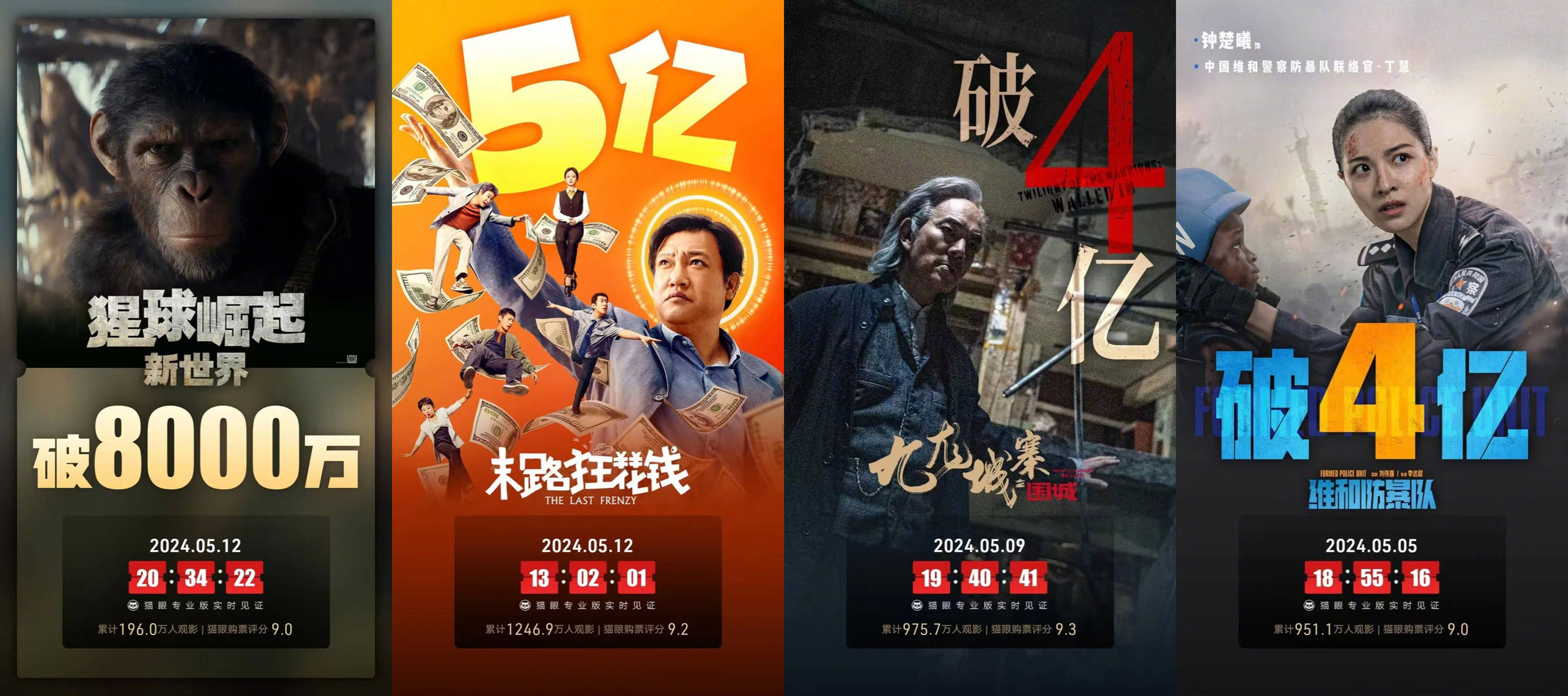 喜剧电影《末路狂花钱》次周收1.29亿夺冠,上映12天累计5.21亿;电影《九龙城寨之围城》次周进账1.25亿居亚,上映12天累计4.61亿;“猩球崛起”系列第四部电影《猩球崛起:新世界》首周末三天收8198.43万排名第三,不及系列前两部成绩。