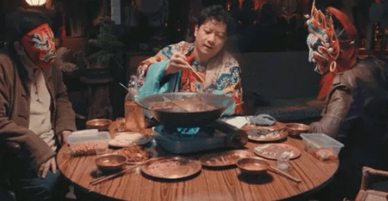 无论面对谁,他都会重复着手口齐的一句“没有一顿火锅解决不了的事”,并搭配一段魔性十足的火锅舞。