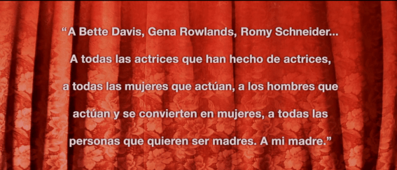 谨以此片献给贝蒂·戴维斯……和所有扮演女演员的女演员;献给所有参演人员,无论男人和女人,或者是变性成女人的男人,和所有想成为母亲的人;献给我的母亲。