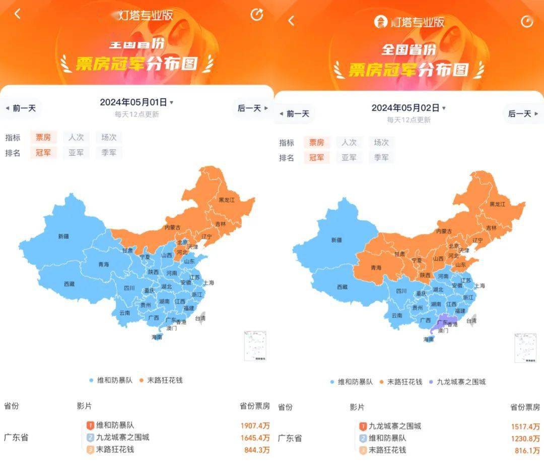 从5月6日至5月9日,电影《末路狂花钱》和《九龙城寨之围城》连续四天各自称霸北方和南方地区的票房日冠,目前两部影片累计均破4亿。