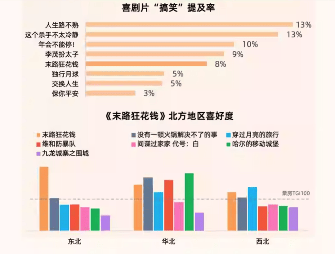 据灯塔专业版数据统计,《末路狂花钱》的“搞笑”提及率为8%,在近年来的国产喜剧片排名里相对靠前,在东北、华北、西北地区的观众喜好度都较高;据猫眼专业版数据统计,影片在东北、华北、西北地区的评分也都超过基准值和其它地区的分数。