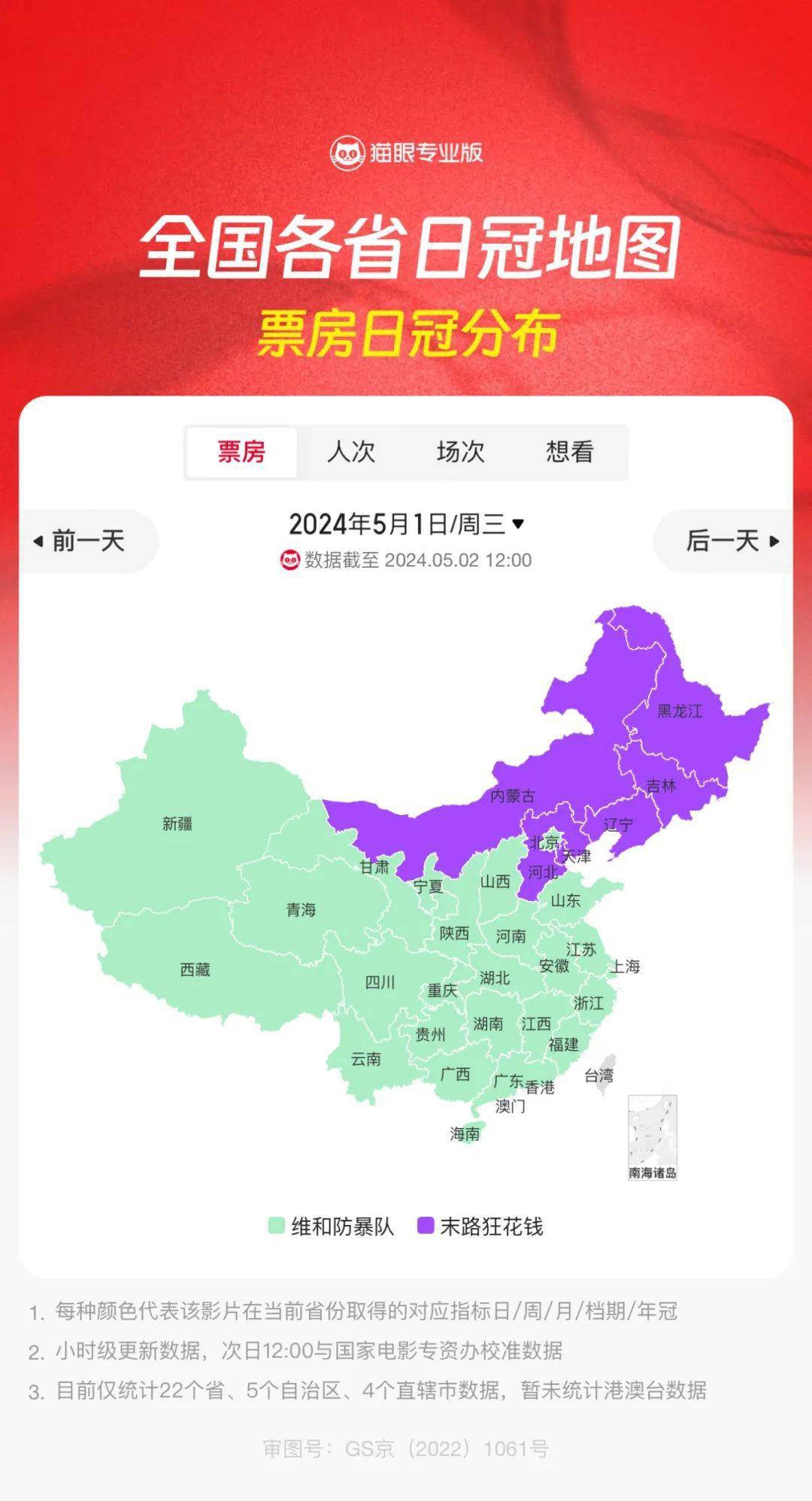 所以凭借突出的喜剧类型,该片的重点票仓得以从东北扩散,往华北、西北地区大幅逆袭。主创也在5月2日、4日分别前往江苏徐州和安徽合肥举行线下路演,在上映初期拉升热度。从5月3日起,江苏省和安徽省的票房日冠也持续被《末路狂花钱》拿下。