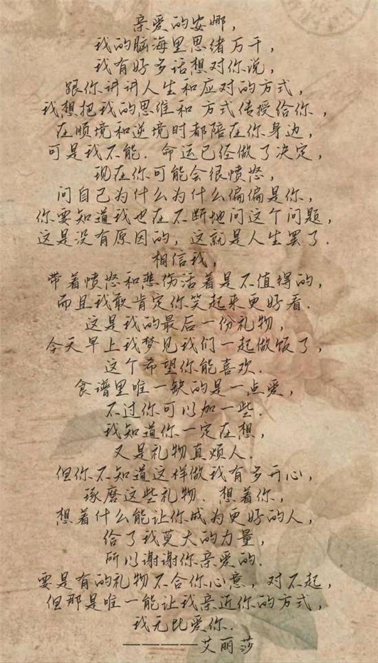2016年8月21日,艾丽莎的女儿出生了,而就在同一天自己却被确诊为乳腺癌晚期。医生告诉她,她的生命仅剩一年,对于艾丽莎而言,最让她不舍的,便是刚刚来到这个世界的女儿。为了让女儿在没有妈妈陪伴的日子中,依然可以感受到母爱,她决定为女儿挑选从1岁到18岁的生日礼物,自行车、洋娃娃、游泳卡,每一件礼物都根据女儿的年龄精心挑选,其中18岁的成人礼物尤其特别,居然是一个贴满了便签的地球仪,每一个便签代表了她希望女儿去到的每一座城市,当礼物全部准备就绪后,艾丽莎却因病情恶化,永远的离开了这个世界。