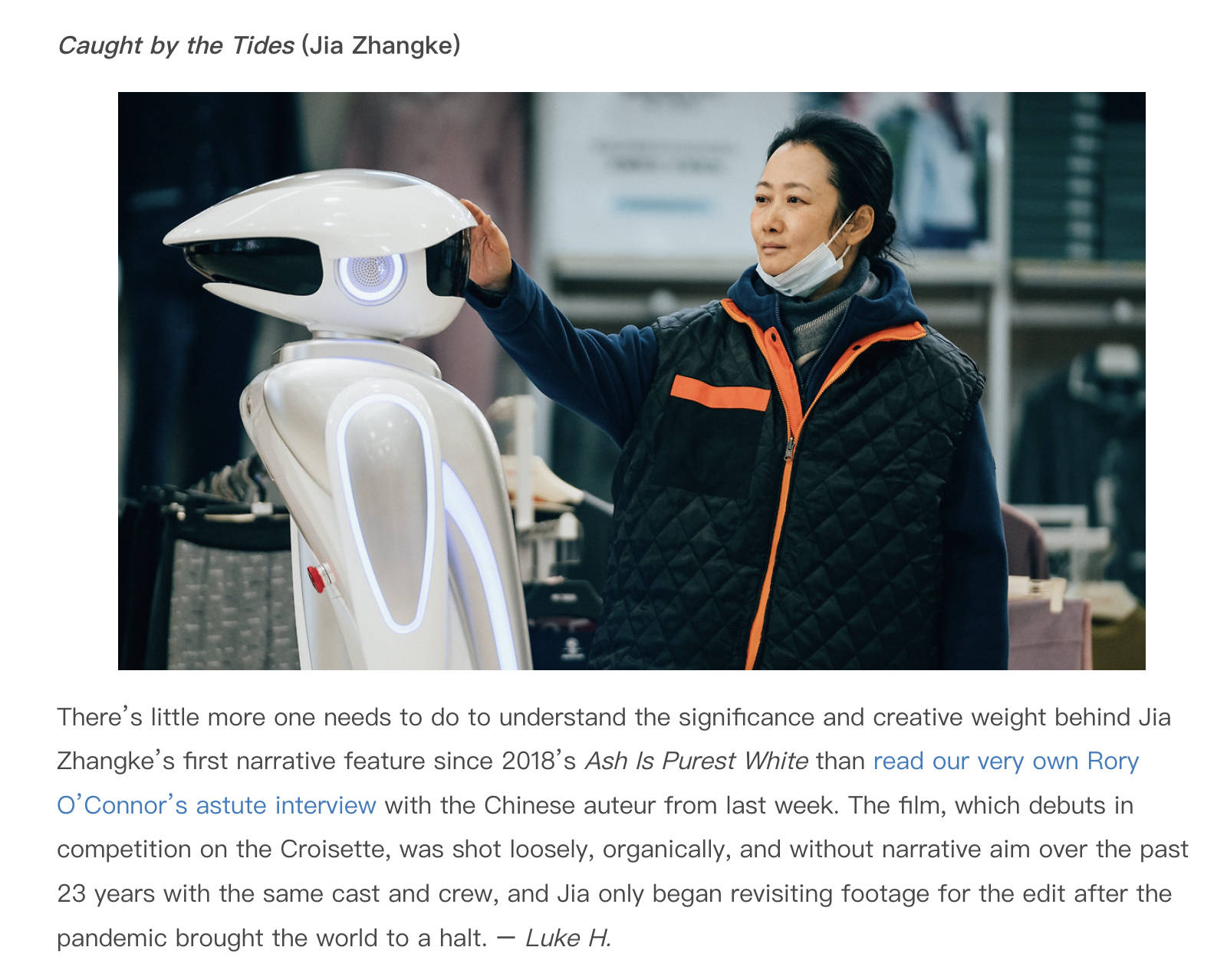 The Film Stage介绍,本片是贾樟柯在过去的23年间用同样的演职人员,松散但有机地、无叙事目标地进行拍摄的;在疫情使世界陷入停顿之后,贾樟柯才开始重新审视23年间的素材,开始本片的剪辑工作。
