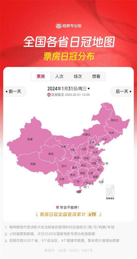 该片在高口碑的不断发酵下,挫败多家同档对手,跨过了秦岭-淮河一线,票房日冠全国登顶累计达到19次。