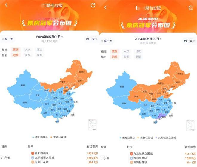 基于地域、文化因素,广东省一贯是港产片的最大票仓,虽然《九龙城寨之围城》在5月1日正式上映首日被《维和防暴队》超越夺得广东省的票房日冠,从5月2日开始,很快就重新回到票房霸主地位,守住了“本命区”。