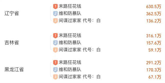 在5月1日上映首日,《末路狂花钱》就迅速占领黑吉辽、河北、内蒙古以及天津市的票冠。尤其在东北三省的单日票房都远远超过第二名,比如《末路狂花钱》在辽宁省当天票房为630.5万,第二名《维和防暴队》票房则为362.5万。