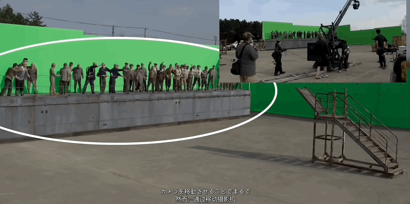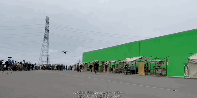 实景是在绿幕前拍摄的,但不够的人头是后期再添上的。