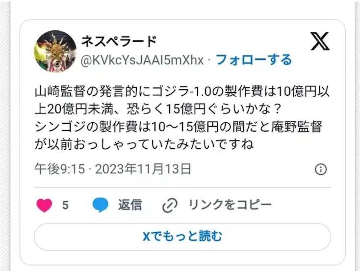 导演山崎贵也曾表示,《哥斯拉-1.0》的制作经费,是美版哥斯拉的二十分之一到十分之一。
