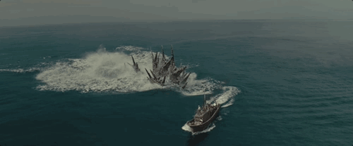 要突出哥斯拉在水中潜行给人的压迫感,重点在背脊的展现。