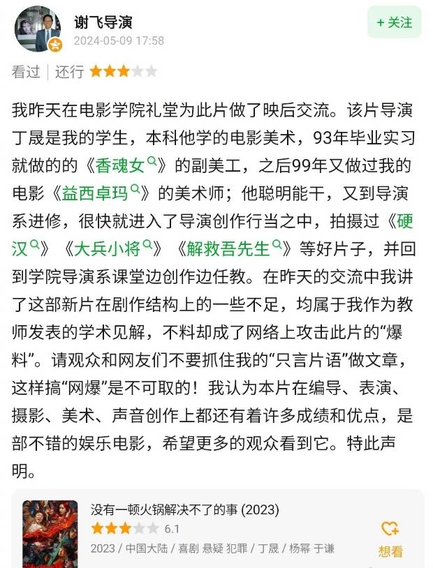 原标题:导演谢飞回应点评《一顿火锅》 为影片打分三颗星