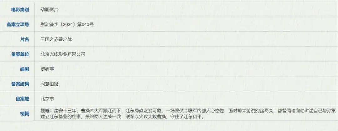 另一部《三国之赤壁之战》由光线影业立项,顾名思义将展现赤壁之战的故事。