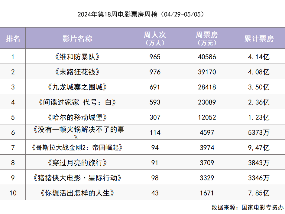 上周(2024/4/29-5/5)全国电影市场共收获票房16.48亿,《维和防暴队》《末路狂花钱》《九龙城寨之围城》位列周票房前三名。