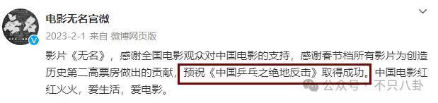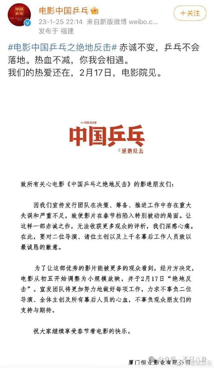 2023年春节档,由邓超、孙俪、许魏洲等主演的电影《中国乒乓之绝地反击》宣布改档。这部电影原本官宣大年初一上映,后来改到大年初三正式上映。