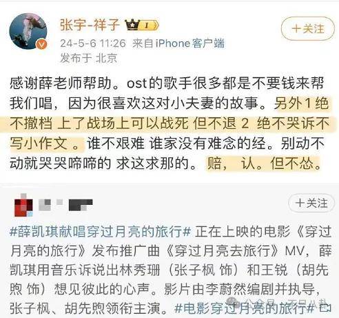 但比起《火锅》选择撤档,《穿过月亮的旅行》制片人昨天则发文称绝不撤档:上了战场可以战死但不退,绝不哭诉不写小作文。赔,认,但不怂。
