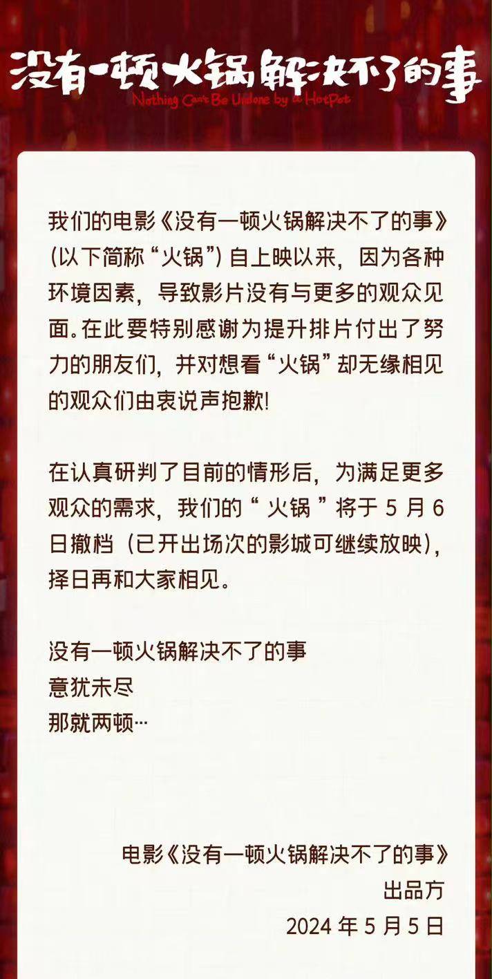 五一档票房成绩不理想,《没有一顿火锅解决不了的事》撤档引发网友争议。