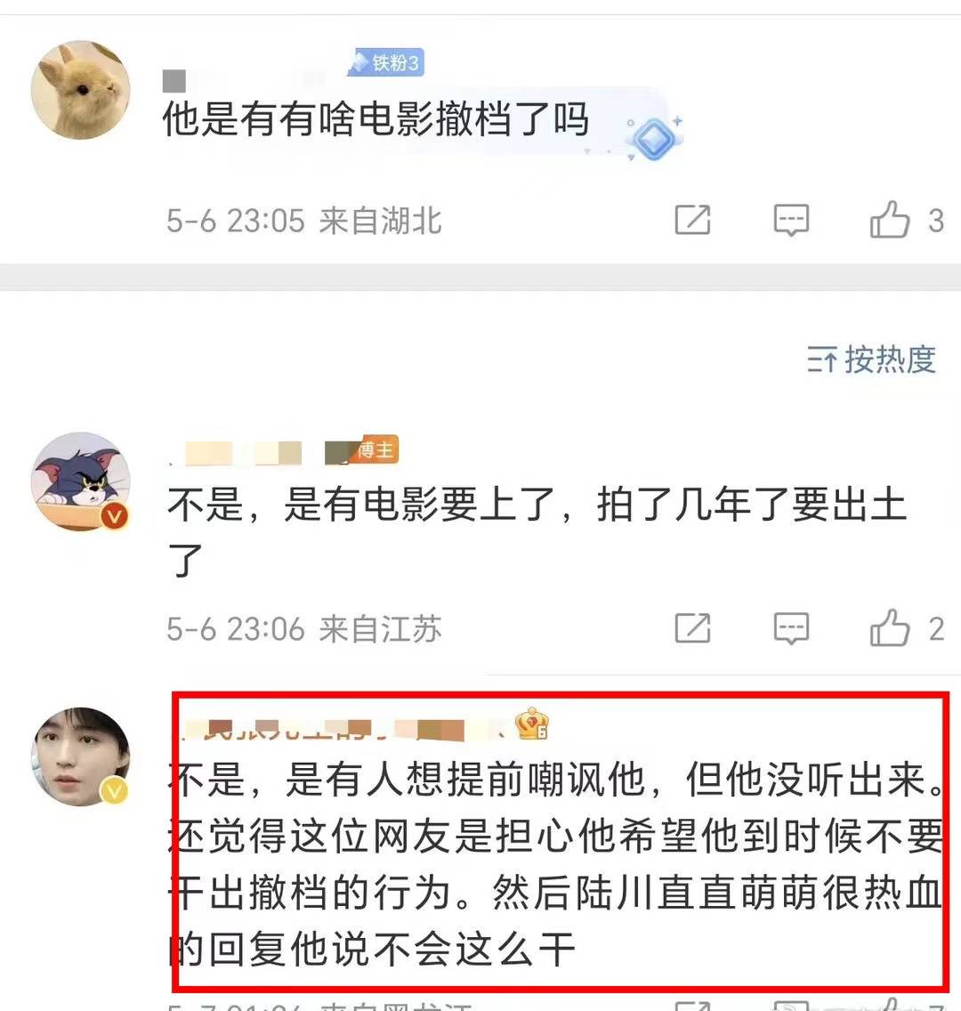网友不理解陆川为什么会这么说,有网友表示有人想提前讽刺他,但他自己没听出来。不觉得这位网友在担心他希望他到时候不要干出撤档的行为,结果陆川回复网友,不会这么干。