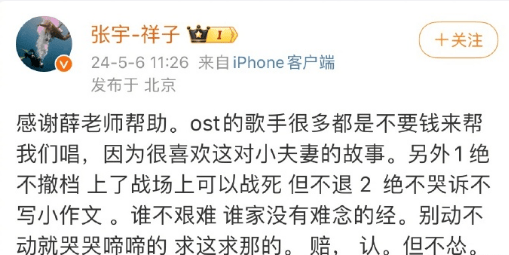 5月6日电影《穿过月亮的旅行》制片人发文称绝不撤档,上了战场可以战死但不退,绝不哭诉不写小作文。赔,认,但不怂。这段话也得到了陆川转发:“不允许我评论几个意思,劳资就说一句,你大爷,懂我!”