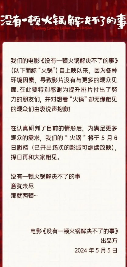 搜狐娱乐讯 近日,杨幂、于谦主演的电影《没有一顿火锅解决不了的事》在五一假期结束后,宣布撤档引发热议。