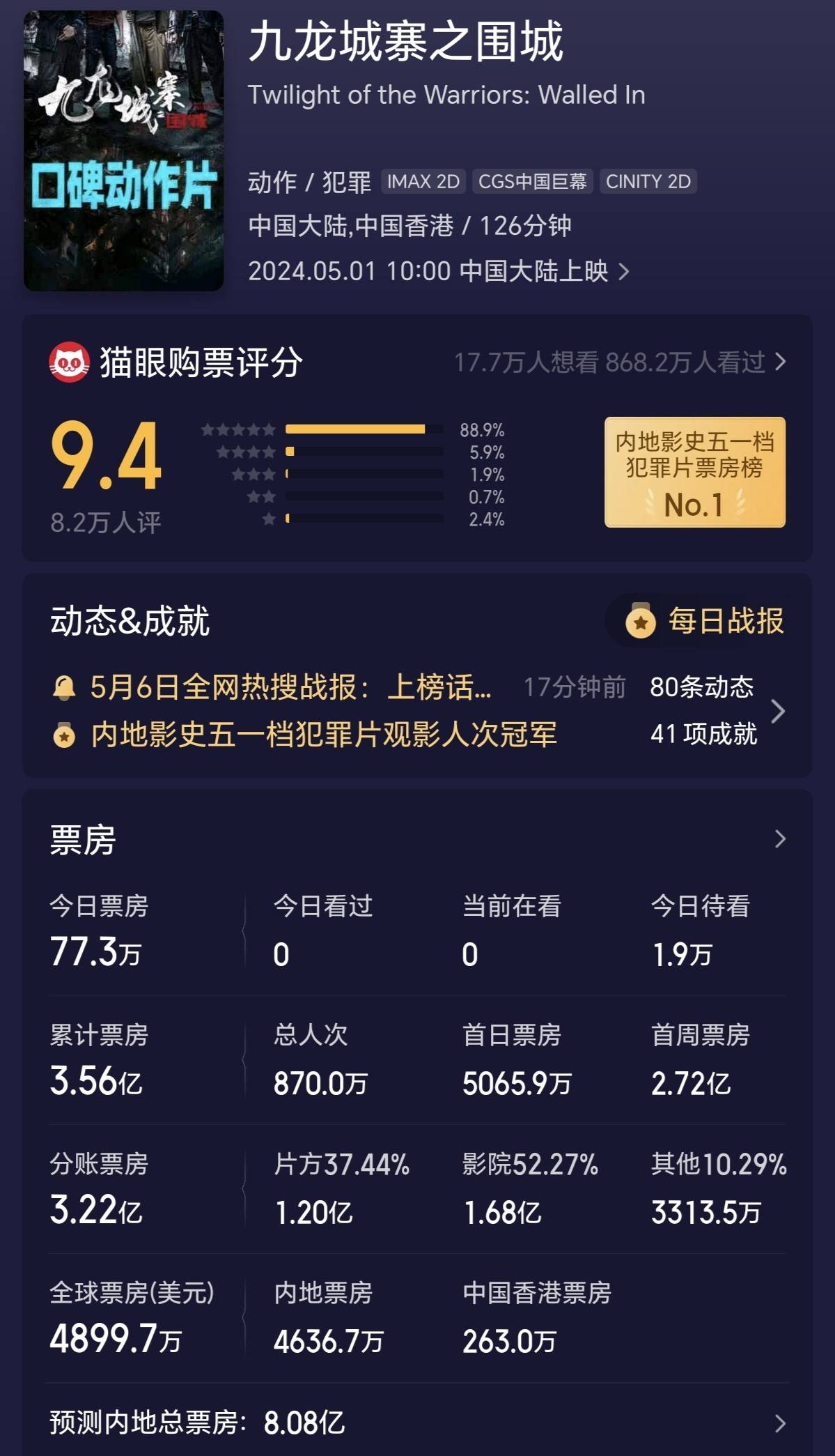 目前《九龙城寨》上座率遥遥领先,后劲相对较足,猫眼专业版预测其最终总票房可能过8亿元,超过《末路狂花钱》《维和防暴队》,成为五一档总票房冠军。
