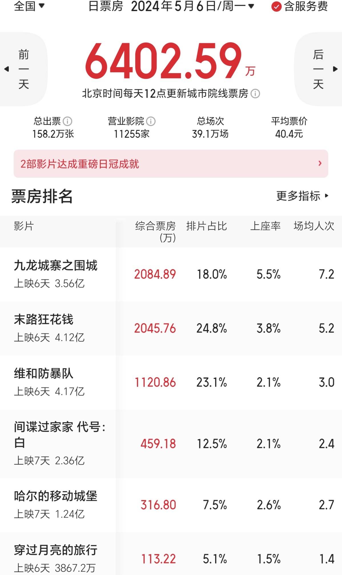 《九龙城寨》继续逆袭,在第二天超过《间谍过家家》,第五天超过《维和防暴队》之后,第六天超过了喜剧片《末路狂花钱》,升居单日票房冠军。