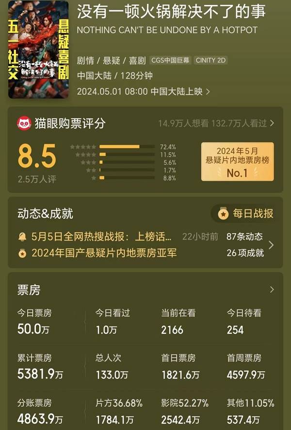到第五日五一档结束时,《没有一顿火锅解决不了的事》排片降到了3.2%,上座率4.9%,日票房242万元,累计票房5332万元。