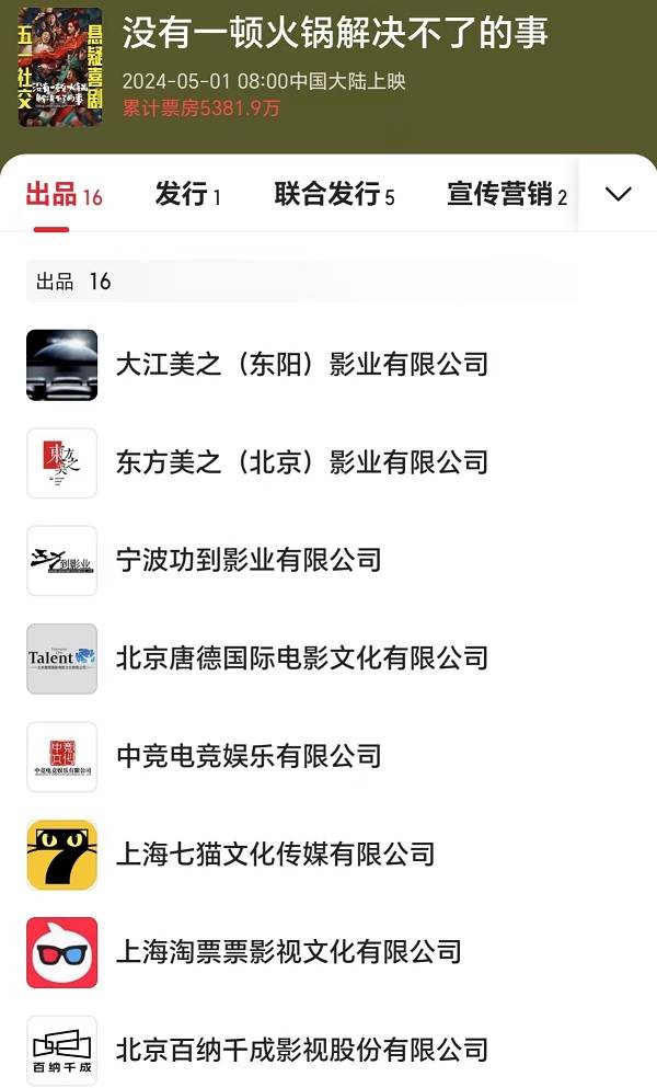 《没有一顿火锅解决不了的事》出品方有16家,主控出品方是东方美之。