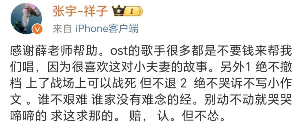制片人张宇称绝不撤档。“上了战场可以战死,但不退。绝不哭诉,不写小作文。谁不艰难?谁家没有难念的经?赔,认,但不怂。”