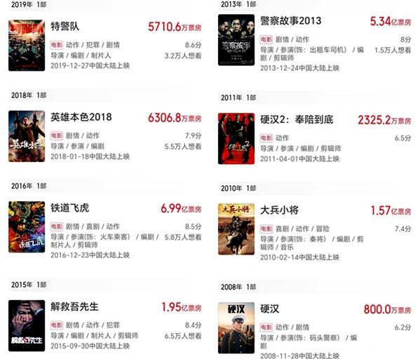 但最近两部以硬汉、动作、兄弟情为卖点的电影《警察故事2018》《特警队》却不灵了。《警察故事2018》《特警队》先后在2018年、2019年上映,分别收6307万元、5711万元,豆瓣评分各4.5分、5.0分,口碑票房双失。