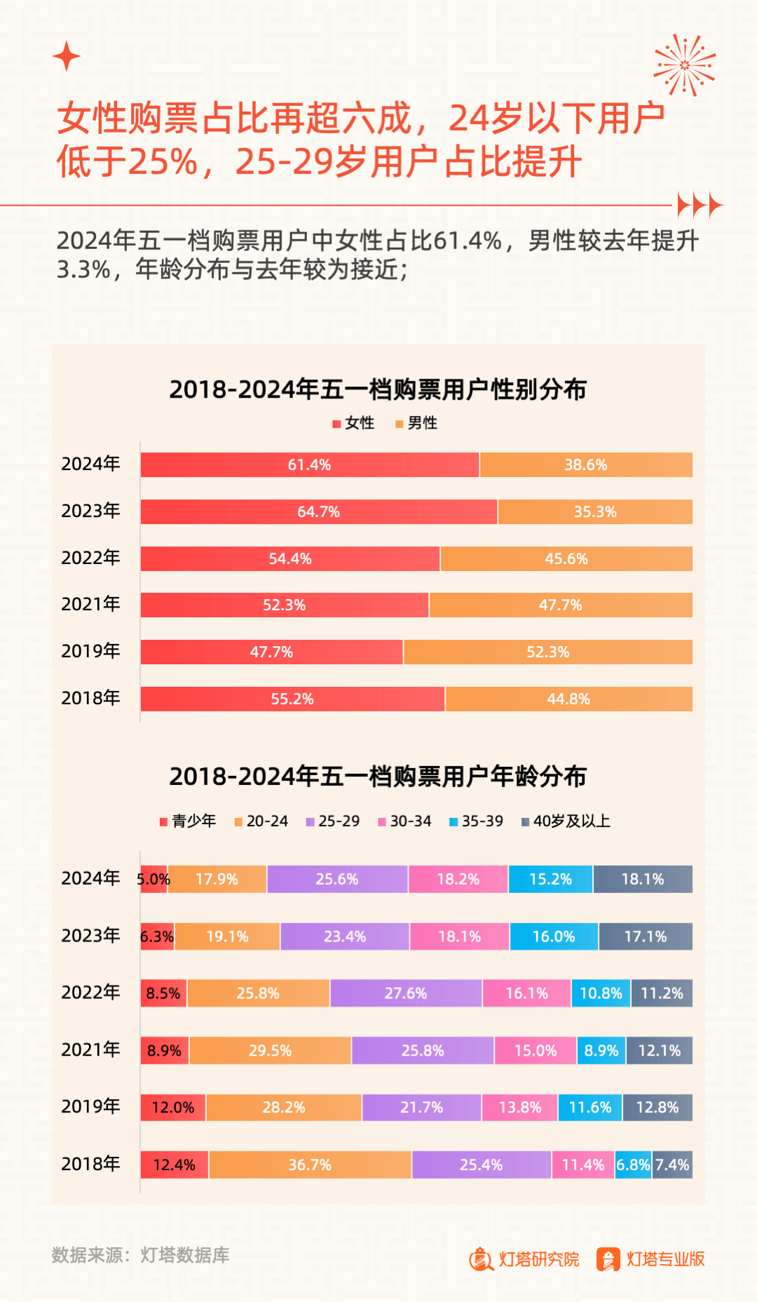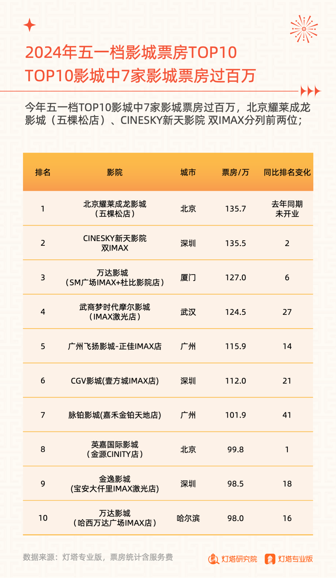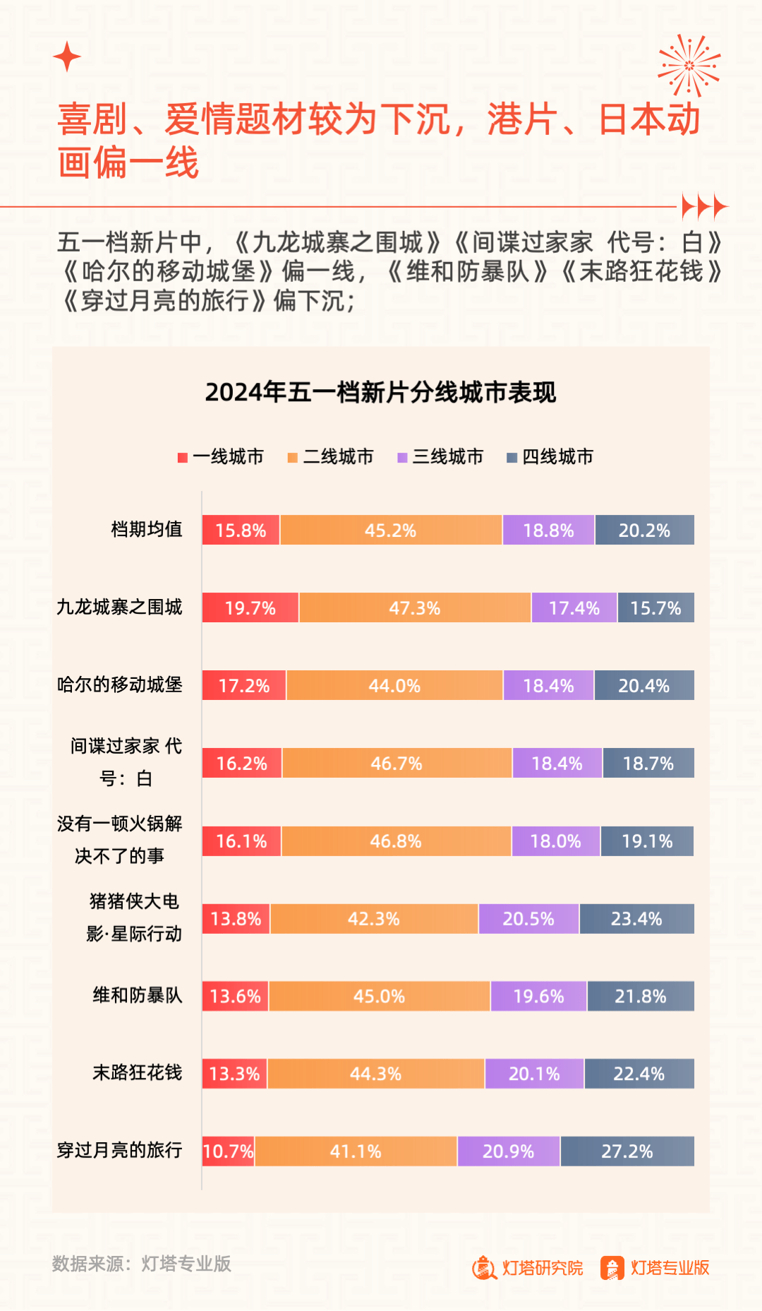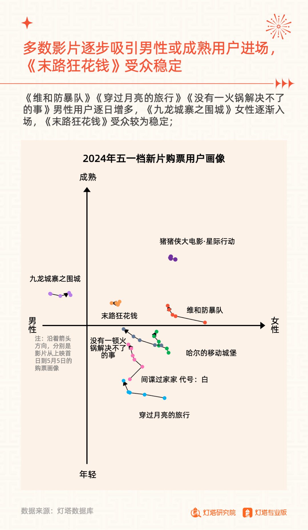 2024年5月6日,灯塔研究院发布《奋楫扬帆,赓续前行——2024年五一档市场洞察报告》,从市场大盘、竞争格局、单片分析和城市影城四大维度进行复盘。