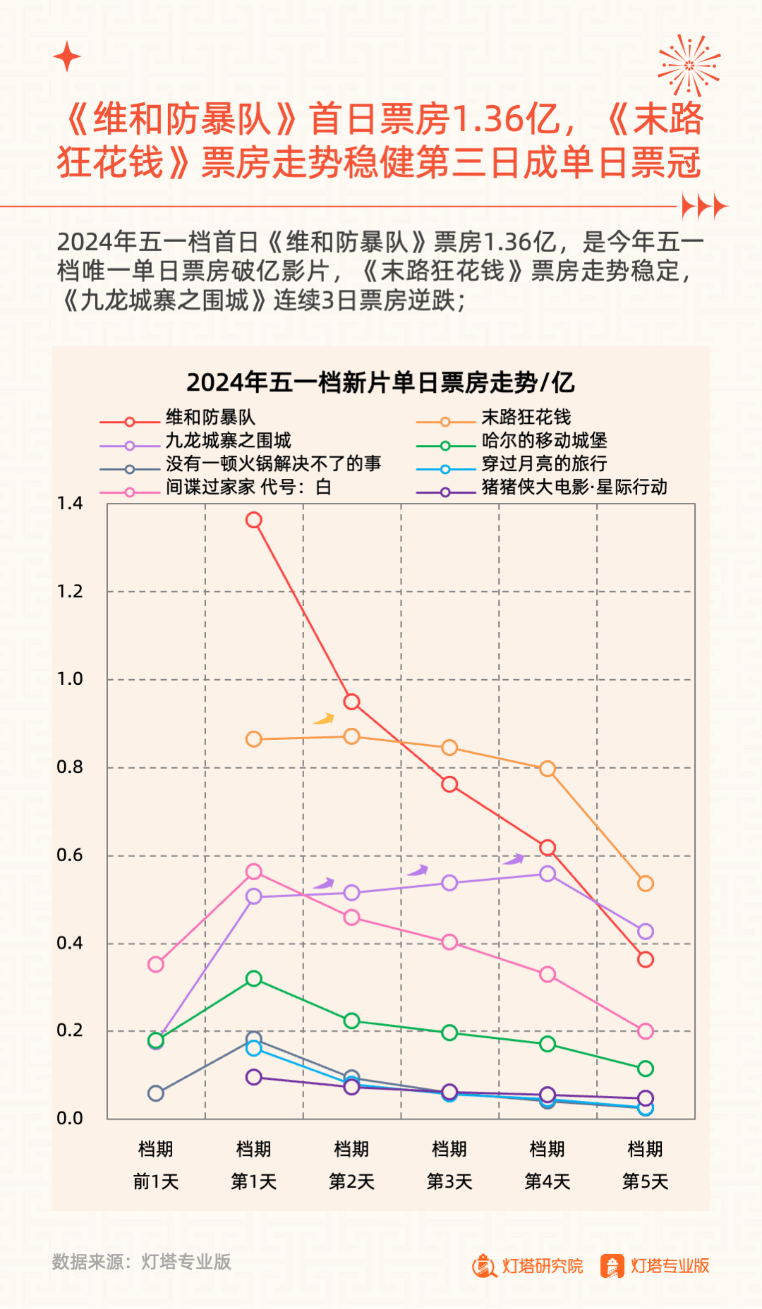 《维和防暴队》首日票房1.36亿,是今年五一档唯一一部单日票房破亿的影片,《末路狂花钱》票房走势稳定,凭借喜剧元素在北方地区占据优势, 《九龙城寨之围城》凭借口碑优势连续3日票房逆跌,《间谍过家家 代号:白》精准捕捉学生受众,高转化。