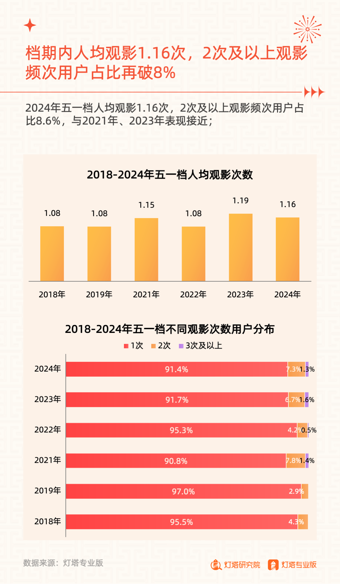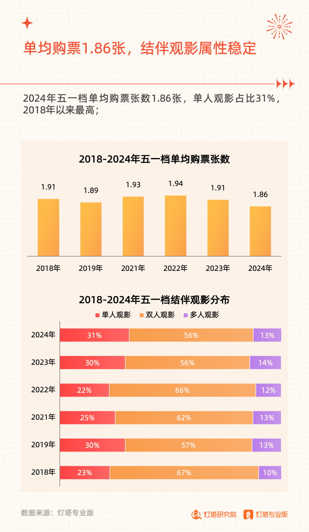 2024年五一档人均观影1.16次,2次及以上观影频次用户占比再破8%;单均购票张数1.86张,基本与往年持平,结伴观影属性稳定。