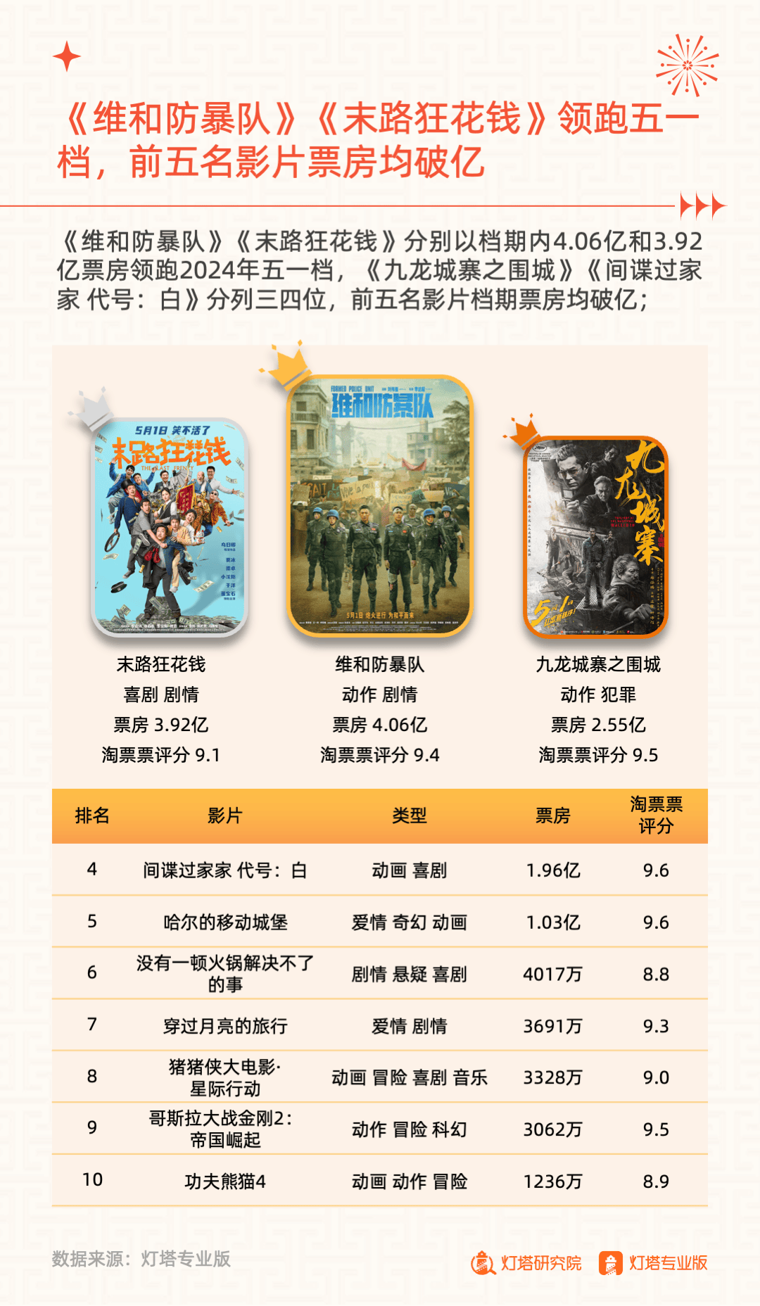 其中,《维和防暴队》以档期内4.06亿票房成绩领跑,《末路狂花钱》《九龙城寨之围城》《间谍过家家 代号:白》《哈尔的移动城堡》位列票房榜二至五位。