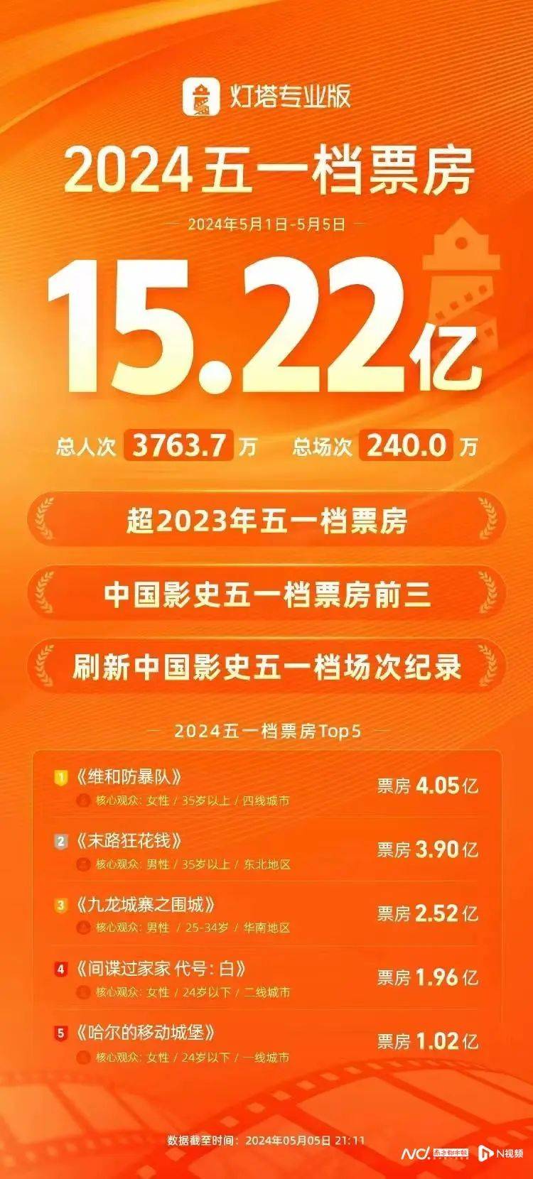 据灯塔专业版数据显示,截至5月5日21时11分,2024五一档(5月1日-5月5日)档期内票房已超过15.22亿元,超过2023年五一档票房(15.21亿元),同时进入中国影史五一档票房前三。今年五一档前5名影片为:《维和防暴队》4.05亿元、《末路狂花钱》3.90亿元、《九龙城寨之围城》2.52亿元、《间谍过家家 代号:白》1.96亿元、《哈尔的移动城堡》1.02亿元。