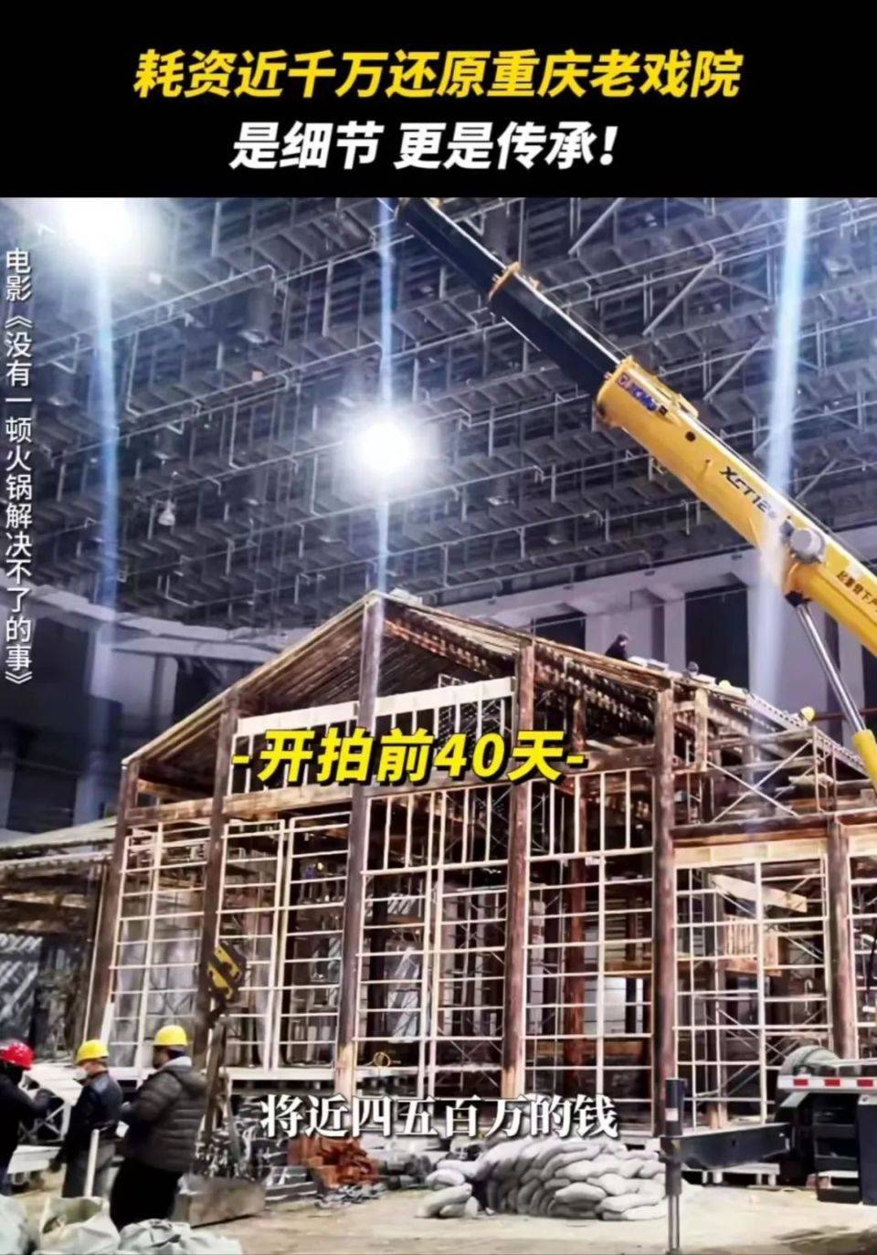 但要实现顺拍,需要在前期做更加充分的筹备工作。《火锅》的主场景,是在中影基地搭建的,耗时接近半年的时间,力求将重庆戏院做到最大程度的还原。在影片公开的制作特辑中可以了解到,置景专门找了比较老的木头进行重新组装,连做地板的石头也磨得很光滑,为了达到最细致的做旧效果。“我们几乎是等同于科幻片的搭景,但是搭的是实景。里面的每一个小灯笼,每一个小摆件,都是在重庆去收购的。”讲武生表示。