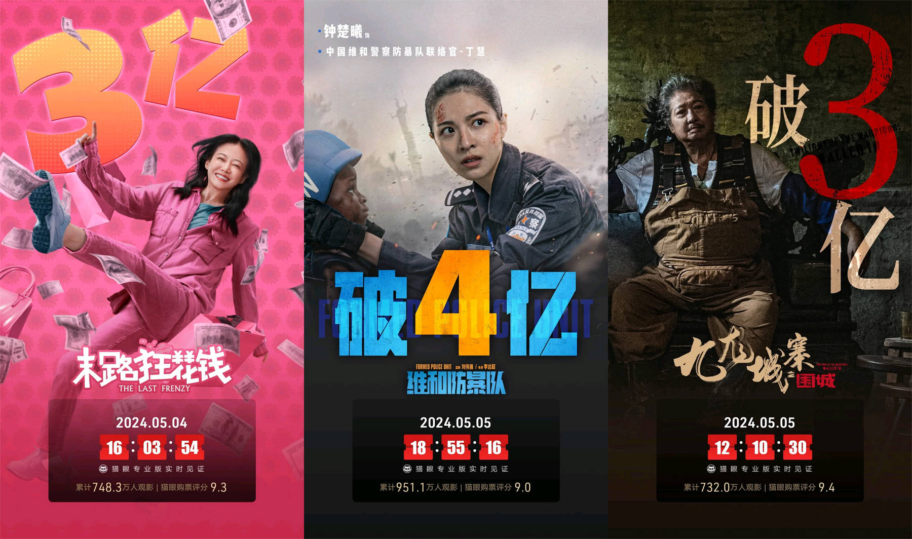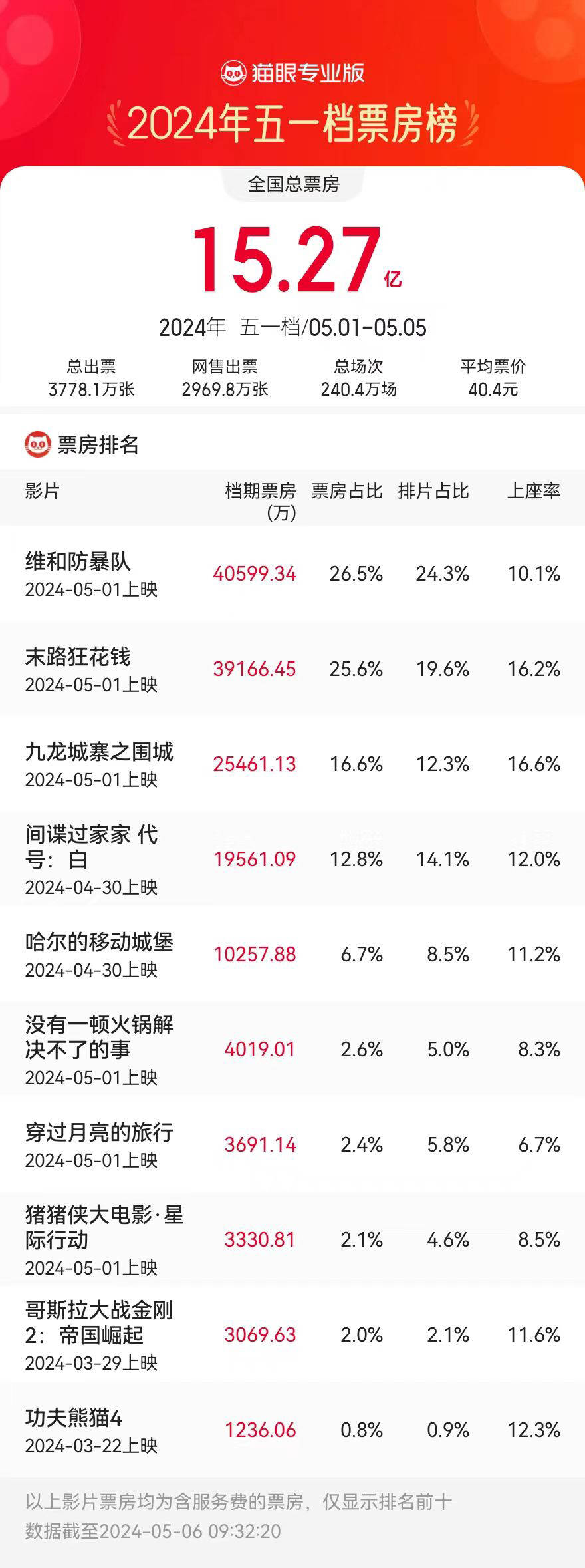 原标题:2024五一档累计票房15.27亿并列影史亚军 《维和防暴队》4.05亿夺档期冠军