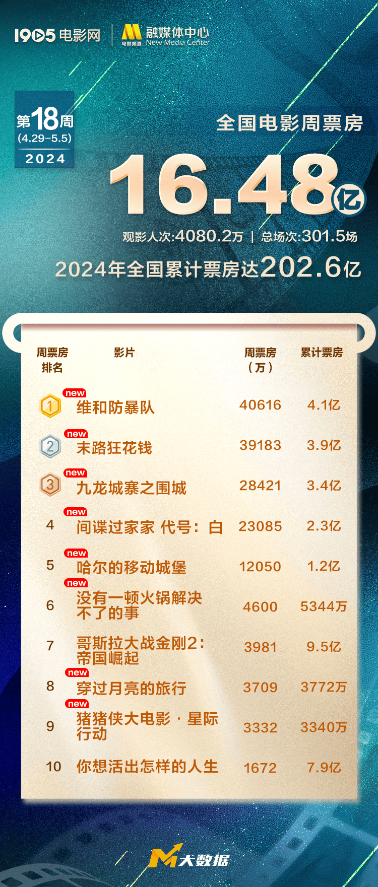 1905电影网讯2024年第18周(4.29-5.5)全国电影周票房16.48亿,观影人次超4080万,总场次超300万场,2024全年电影票房累计202.6亿。