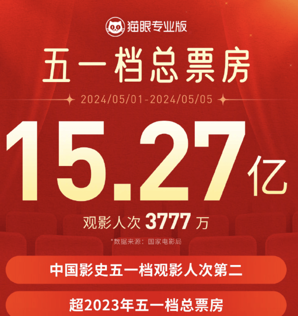 原标题:2024五一档电影票房15.27亿 观影人次3777万