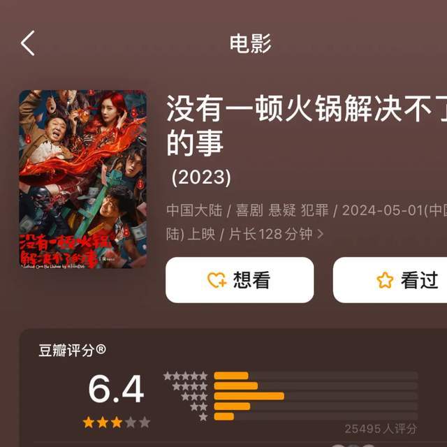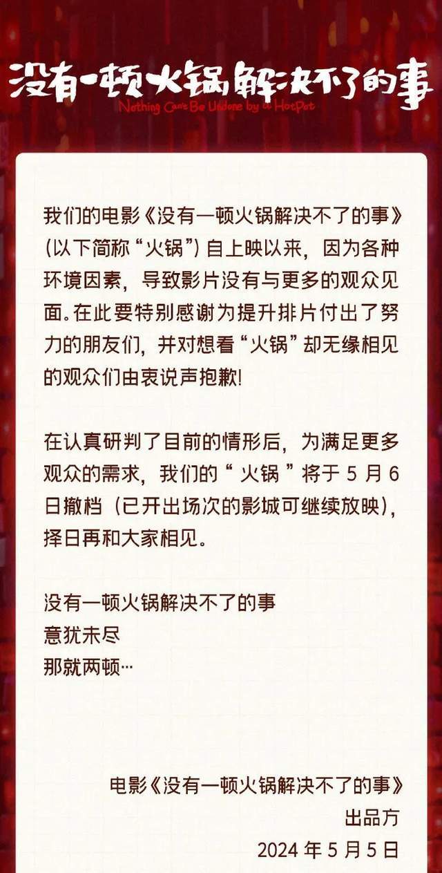 今年五一假期表现最一般的电影,应该就是杨幂主演的《没有一顿火锅解决不了的事》。五天时间票房仅仅只有4800w,预期票房大幅下调,从最开始的1.5亿一直调到7300w左右。评分也不高,6.4,不伦不类,悬疑片没逻辑,喜剧片笑不出来。看着前路一片迷茫,片方于5月5日,上映的第五天宣布撤档。之前就已经改过档期,现在上映了又逃跑,就算重开一局,恐怕也好不到哪去。