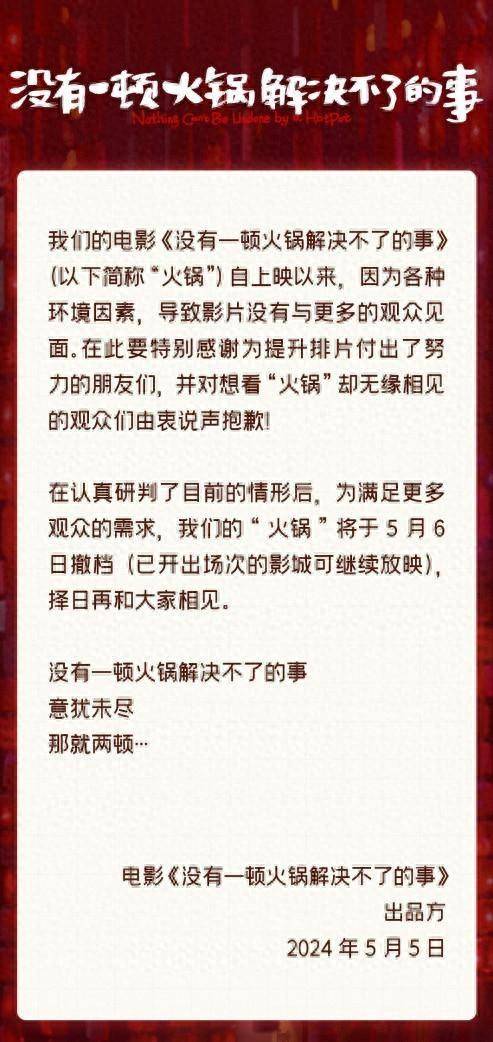五一假期档上映的电影《没有一顿火锅解决不了的事》,今天宣布了撤档。