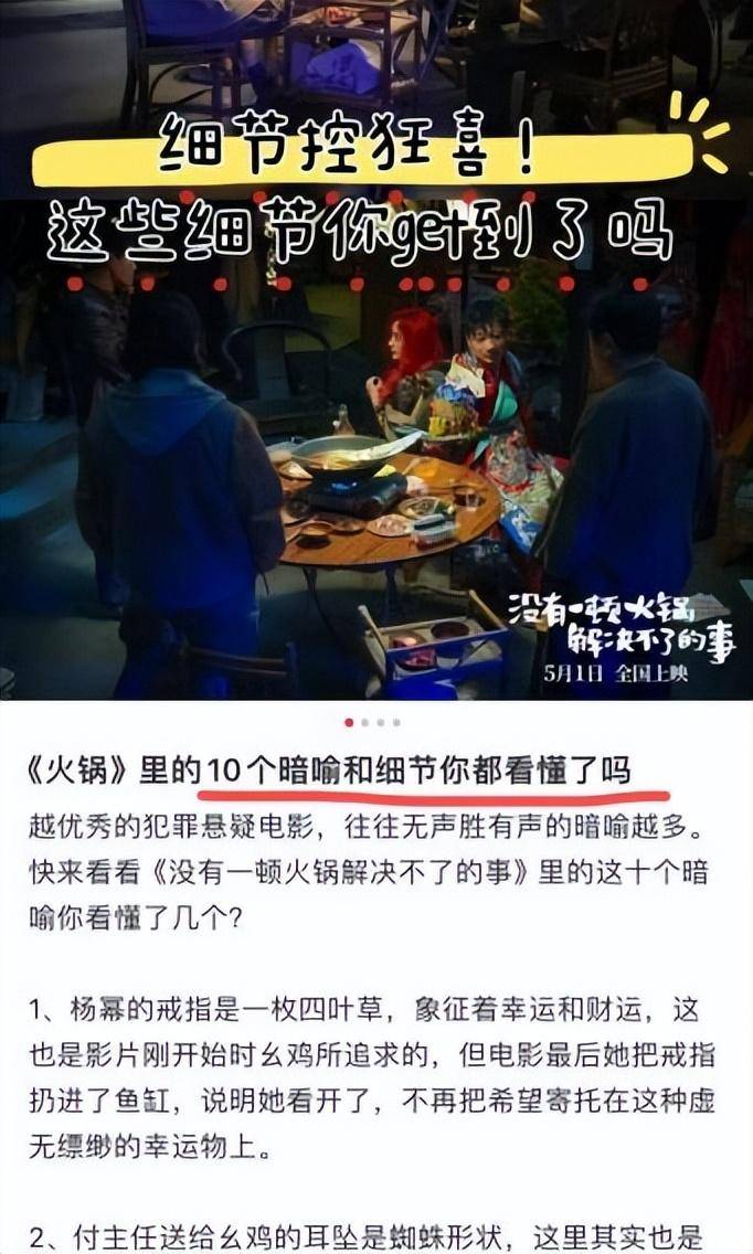 这种沉浸式观影也和现代观众的观看方式不同,在短视频十分钟解说一部电影,观众逐渐会失去对“讲故事”的耐心,所有电影都是“小美大壮”做主角的电影解说里,《没有一顿火锅解决不了的事》更像是一个加长剧情超长待机的剧本杀——既不能错过同伴说的话,自己做出判断的同时也不能放过任何一个画面细节。这对于观众来说并不是一件容易的事情。