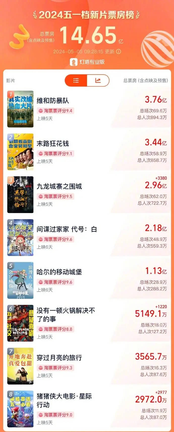 搜狐娱乐讯 5月5日,据灯塔专业版,截至5月5日9时28分,2024五一档(5月1日至5月5日,含预售)档期内票房已突破14亿!