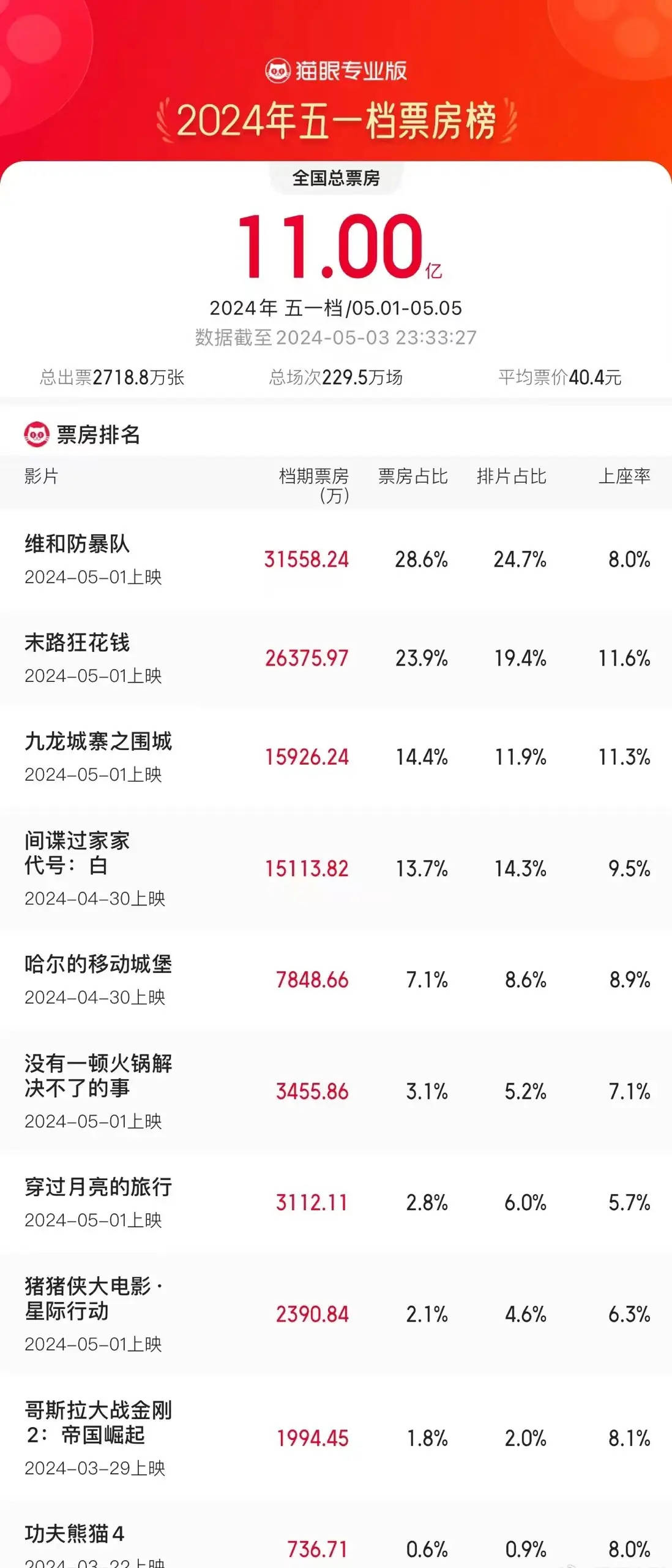 搜狐娱乐讯 据猫眼专业版数据,截至5月3日23时33分,2024年五一档(5月1日-5月5日)总票房突破11亿!《维和防暴队》《末路狂花钱》《九龙城寨之围城》分列档期票房榜前三位。