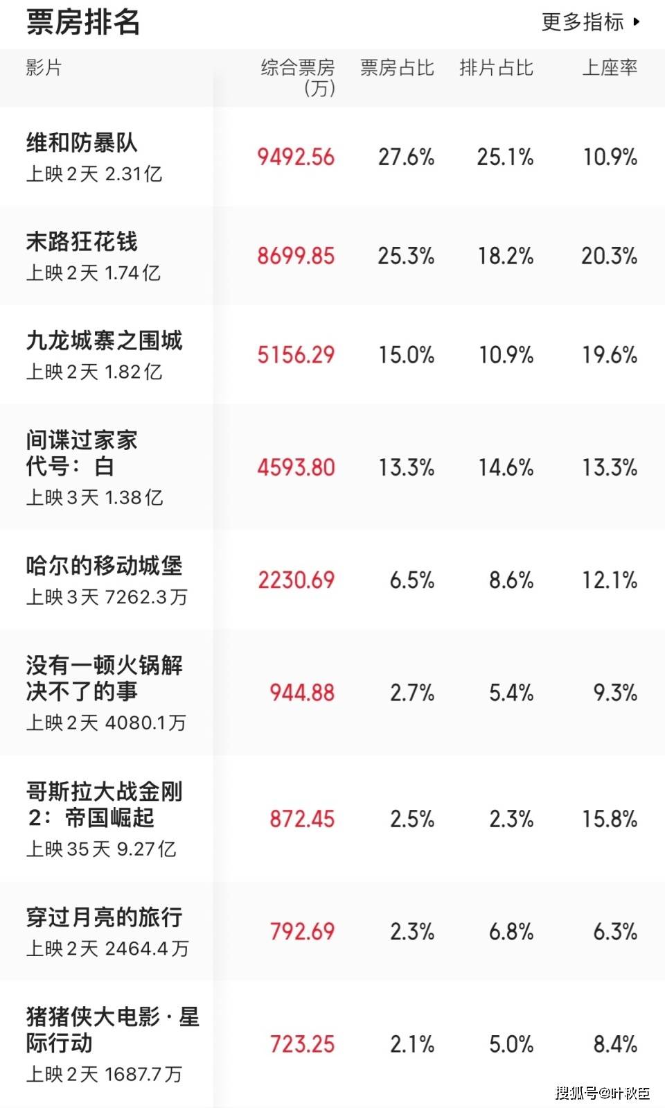 TOP 5分别是《维和防暴队》《九龙城寨之围城》《末路狂花钱》《间谍过家家 代号:白》和《哈尔的移动城堡》。