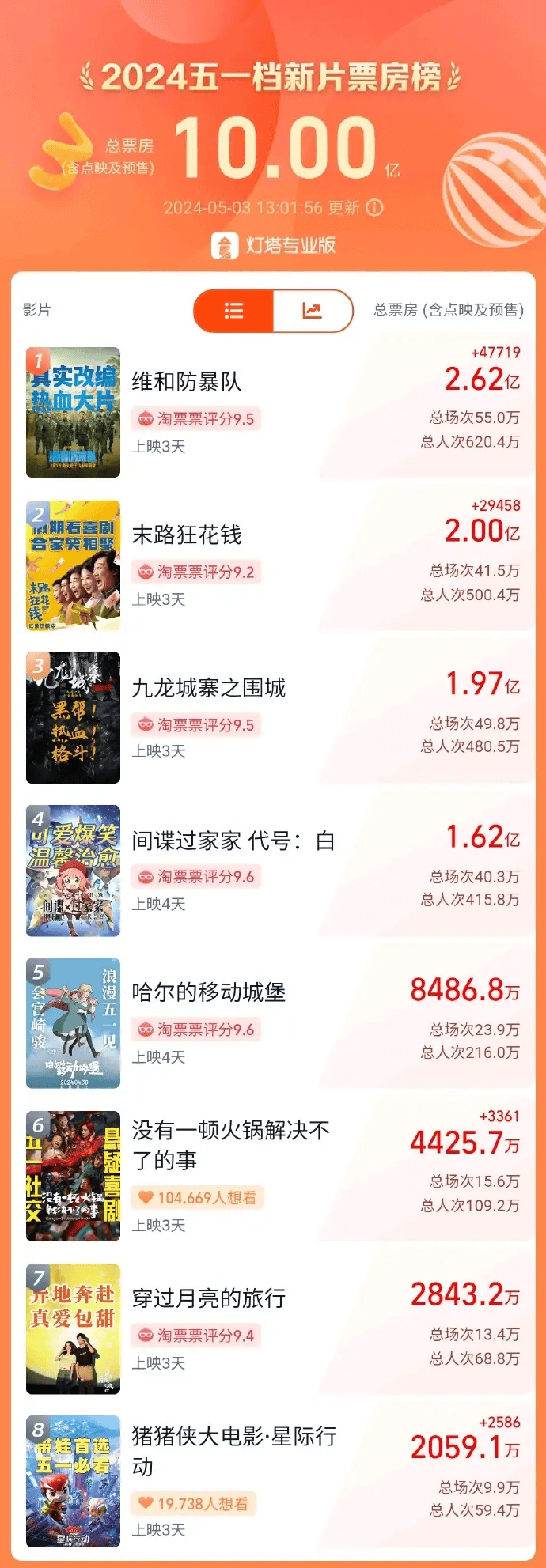 原标题:五一档电影票房破10亿 《维和防暴队》暂列第一