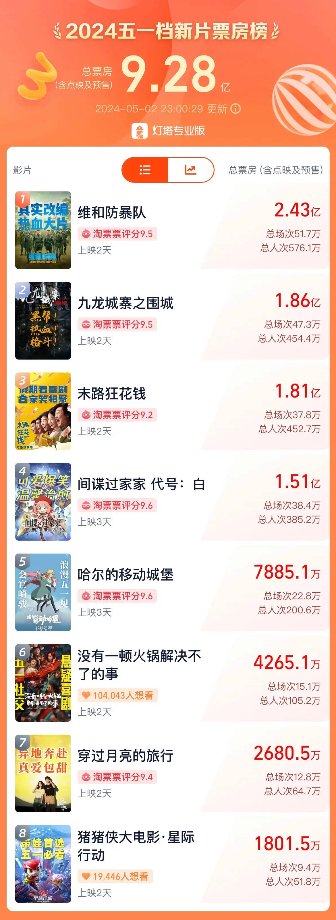 搜狐娱乐讯 据灯塔专业版,截至5月2日23时,2024五一档新片总票房(含预售)已突破9亿。《维和防暴队》《九龙城寨之围城》《末路狂花钱》暂列当前票房(含预售)前三位。